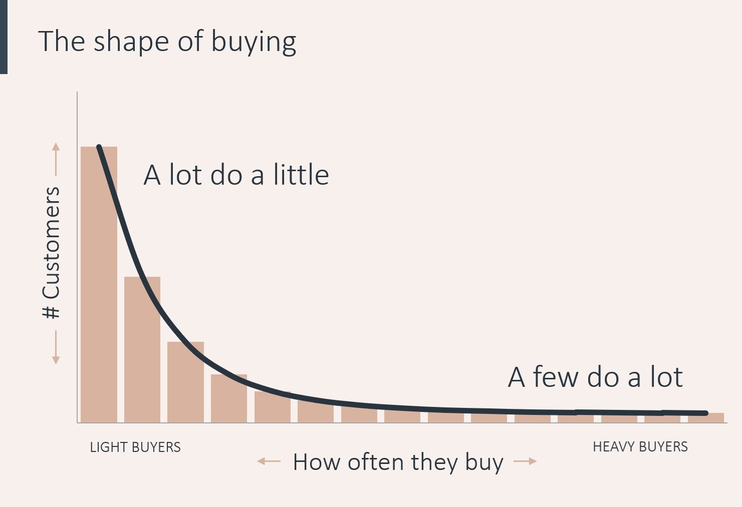 The NBD (Negative Binomial Distribution) tells you why. The NBD is the name of the shape that emerges when you plot the frequency or value of buying against the number of customers. The shape is the same for any given brand in any given category. Every brand has many light/low value buyers and few heavy/high value buyers. As a marketer, it is perhaps the most fundamental thing to know, because THIS SHAPE DOESN’T CHANGE.